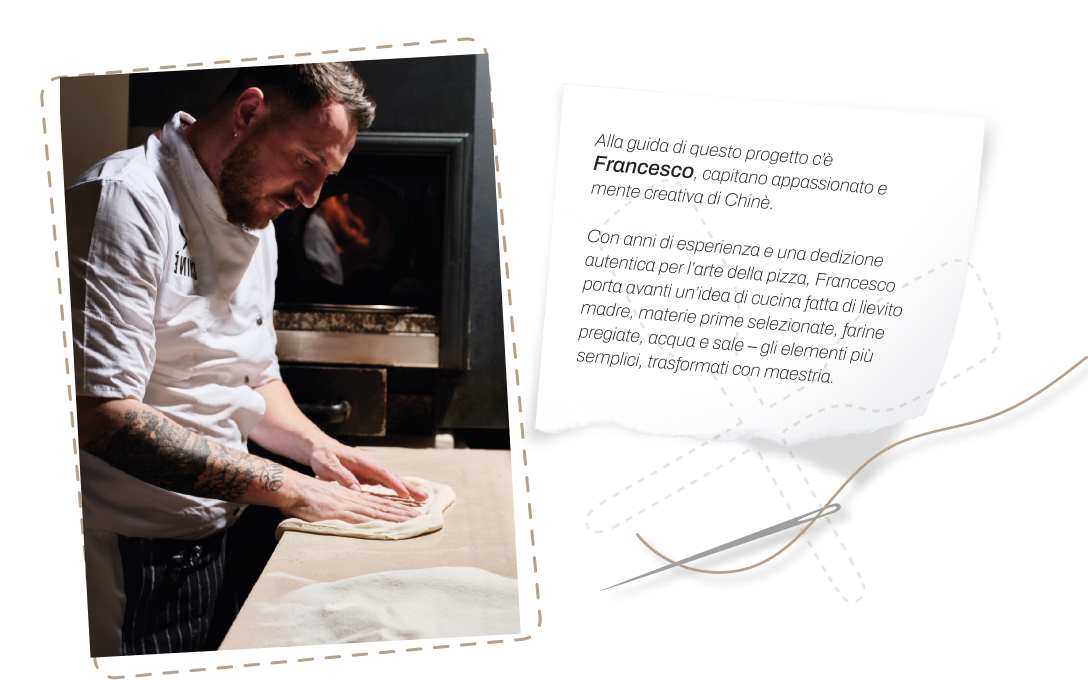 Offrire un’esperienza culinaria su misura: attenta alle intolleranze, ai gusti personali e sempre aperta all’inventiva. Chinè è il luogo dove la tradizione incontra l’innovazione, dove ogni pizza è pensata per “vestire” il palato proprio come un abito sartoriale: unico, autentico, perfetto per te.