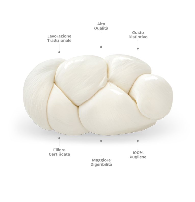 Prodotto in Puglia con latte 100% italiano, filato a mano per garantire morbidezza e un sapore inimitabile sulla pizza calda.