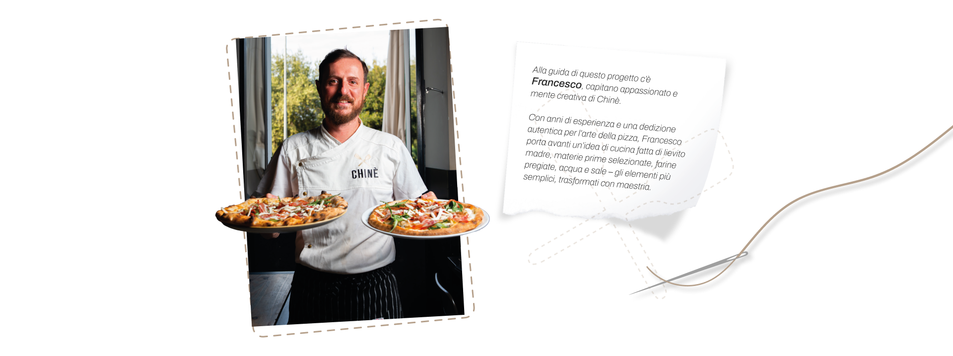 Offrire un’esperienza culinaria su misura: attenta alle intolleranze, ai gusti personali e sempre aperta all’inventiva. Chinè è il luogo dove la tradizione incontra l’innovazione, dove ogni pizza è pensata per “vestire” il palato proprio come un abito sartoriale: unico, autentico, perfetto per te.
